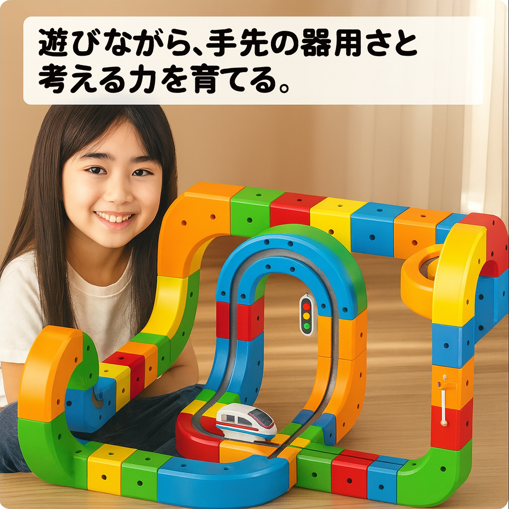 ある日、ただ遊んでいるだけだと思っていた時間が、実は子どもの成長につながっていることに気づきました。ブロックを組み立て、レールをつなぎ、「どうしたらうまく走るかな?」と考える。その一つひとつの動作が、手先の器用さ、集中力、そして想像力を育てていきます。夢中になって遊ぶ時間こそが、